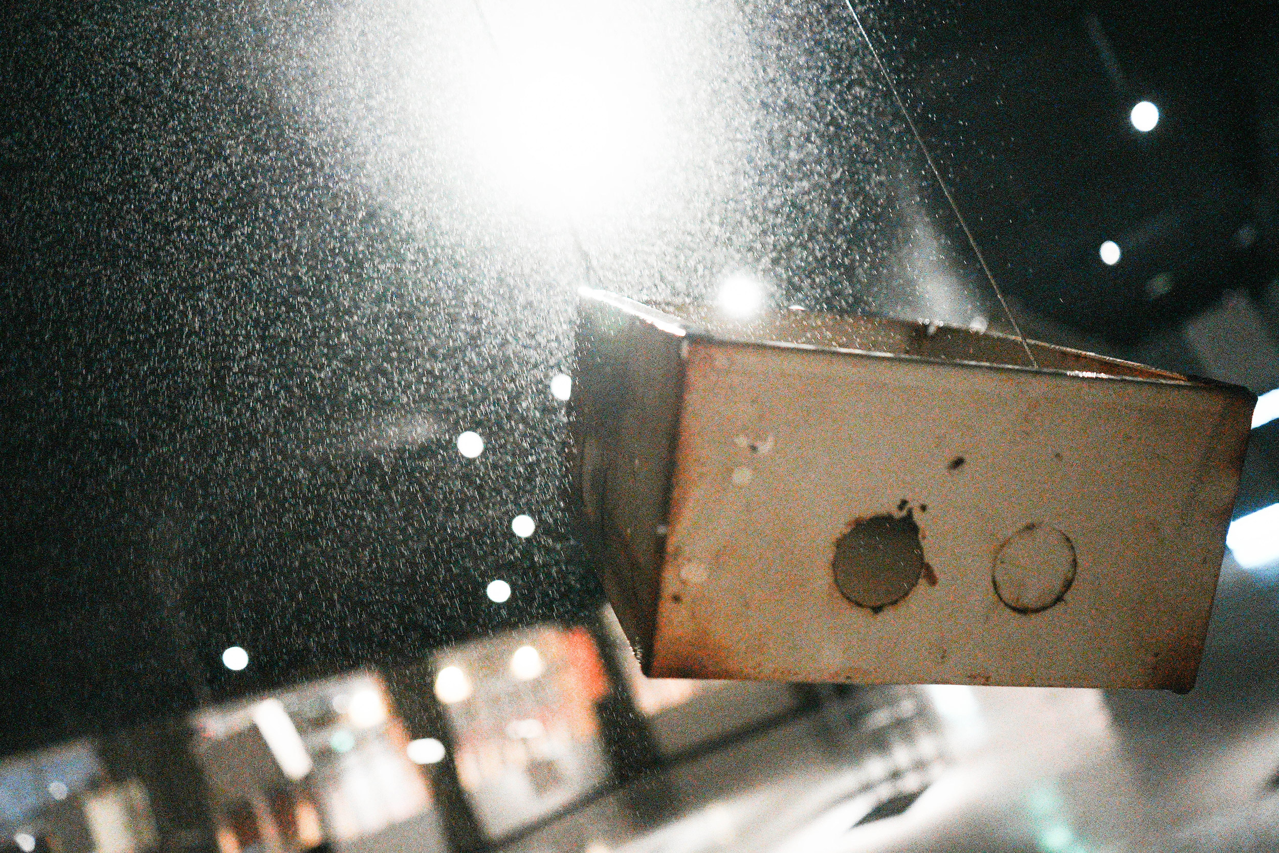 A misting system is installed according to the exhibition space, with polymer coated iron sheets suspended below, or other common coated objects. The objective is to test how humidity can be controlled inside an enclosed yet also relatively open space. Moreover, without interfering with the viewing experience and also without causing people to slip and fall, humidity is added to speed up the corrosion process on the metal and for rust marks to manifest and change throughout the short period of the exhibition. The rust that then drips down due to the force of gravity then becomes a carrier that proves the accrual of time.